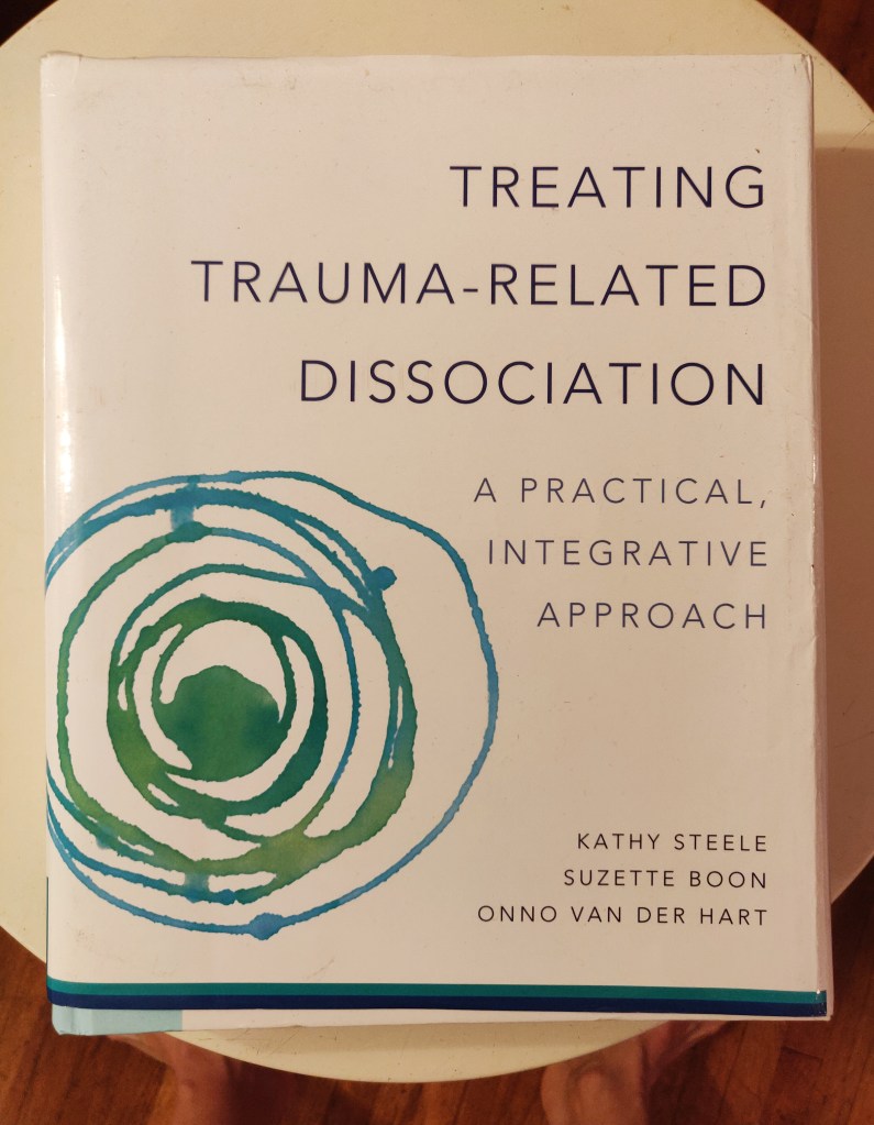 The cover is getting tattered and I’m STILL not fully through it, but READ THIS BOOK! I cannot emphasize enough how critical it is, particularly in trauma work, to be able to identify dissociation in our clients. We ALL dissociate to some degree – daydreams, spacing out, finding ourselves thinking one thing but instead saying the thing we KNOW will cause trouble. (Been there, done that.)